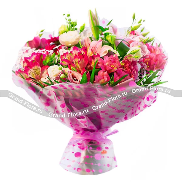 Нежно-розовый букет, с неповторимым ароматом, станет замечательным подарком на любое торжество. Богатая композиция из свежих цветов альстромерии, лилии и эустомы, удивит даже самого требовательного покупателя. Ураган нежности унесет вас в мир мечтаний и любви, прямо у вас дома или в офисе.